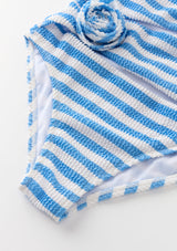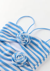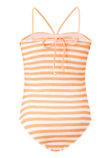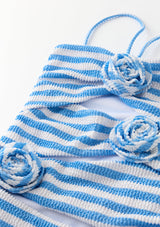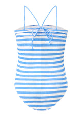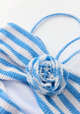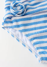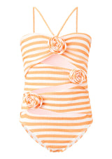 The Nellie Full Piece is a playful and modern take on the classic swimsuit. Crafted in our exclusive stripe print with bold rosette details and statement cut-outs, this one-piece blends fun with sophistication for days by the pool or at the beach. Available in orange stripe or blue stripe, layer under the Avelle Pants for a coordinated holiday-ready look.