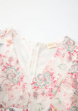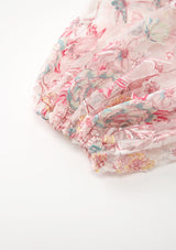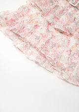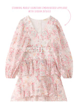 The Camille Dress is a mini dress with Marlo floral print applique on a soft tulle fabrication, long balloon sleeves, and a tiered ruffle skirt. This dress is perfect for creating a charming and unique appearance.